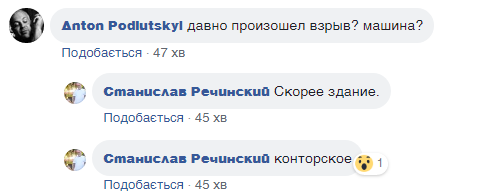 По информации УНН, вероятно, взорвался автомобиль. Однако Речинский предполагает, что ЧП произошло в неком «конторском здании».
