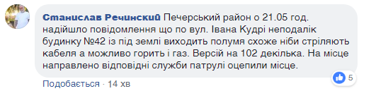 В комментариях он уточнил, что недалеко от дома №42 очевидцы заметили выходящее из-под земли пламя. Сообщение в полицию поступило в 21:05. «Похоже, будто стреляют кабеля, а возможно горит и газ. Версий на 102 несколько», — написал он.